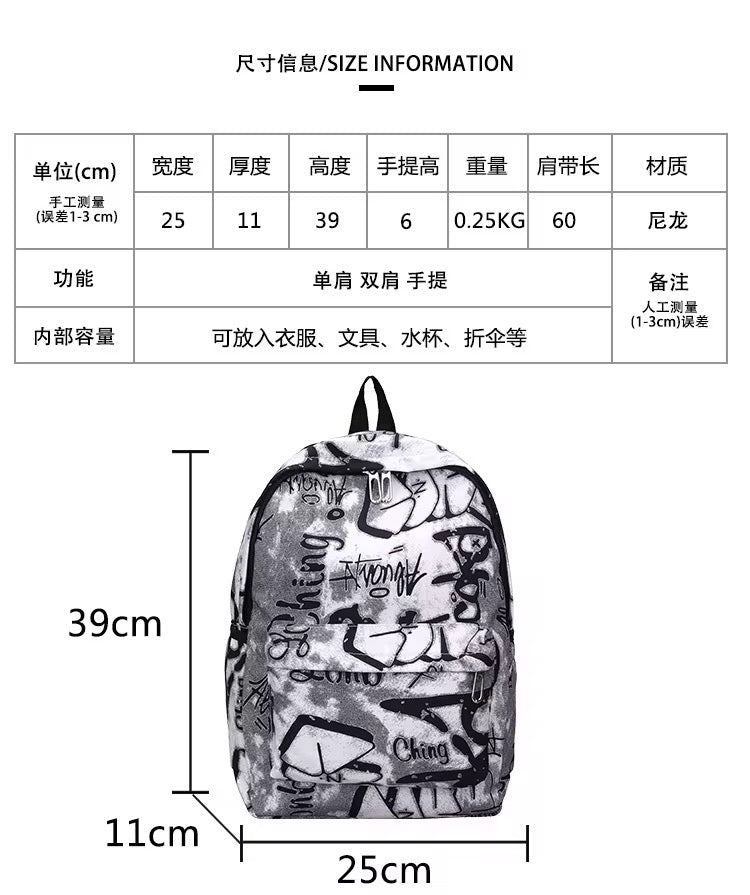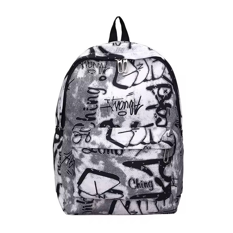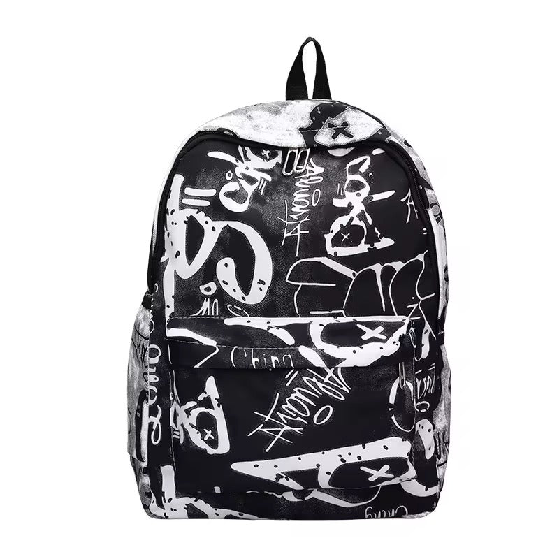 This street-ready backpack features a bold, black-and-white graffiti pattern on durable nylon fabric, with ample room for books, tech, and more. Designed for comfort and convenience, it offers padded shoulder straps, a spacious main compartment, and a front zip pocket for easy access to your daily essentials. Effortless style meets practical design.