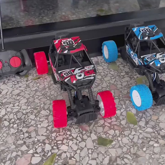 Built for thrill-seekers, this rugged RC car features oversized red tires, a shock-absorbing suspension, and a durable black chassis with aggressive decals like “ROCK” and “FAST.” Its compact remote control puts power in your hands, letting you tackle rough terrain, sharp turns, and high-speed stunts with ease.