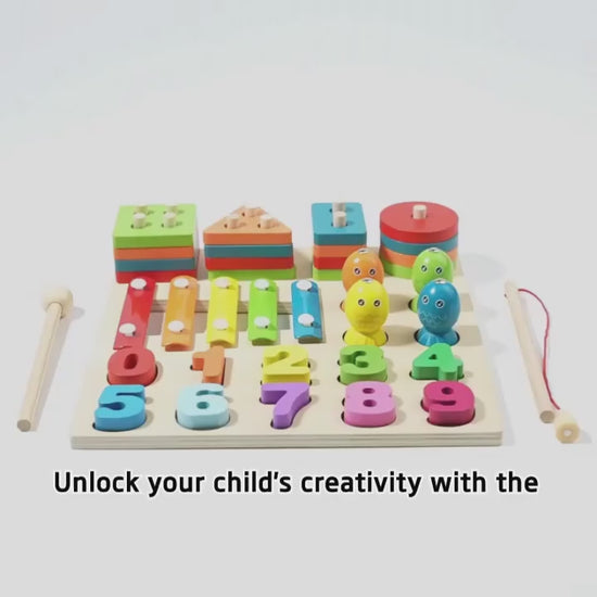 • Includes: Numbers 0–9, geometric shapes, rings, fish, and pegs